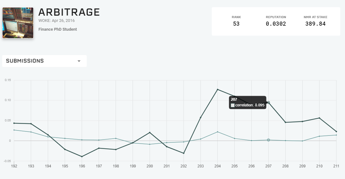 If the weighted average of your reputation is positive, it shows you’ve consistently produced high correlation predictions, and that can be ranked over time. Arbitrage added that, while Rep Score might not matter much beyond bragging rights without the bonus, data scientists should continue to submit predictions in the event Numerai introduces a new payment system based on some kind of rolling performance. Should that happen, it’s in the participant’s best interest to have weekly submission consistency.