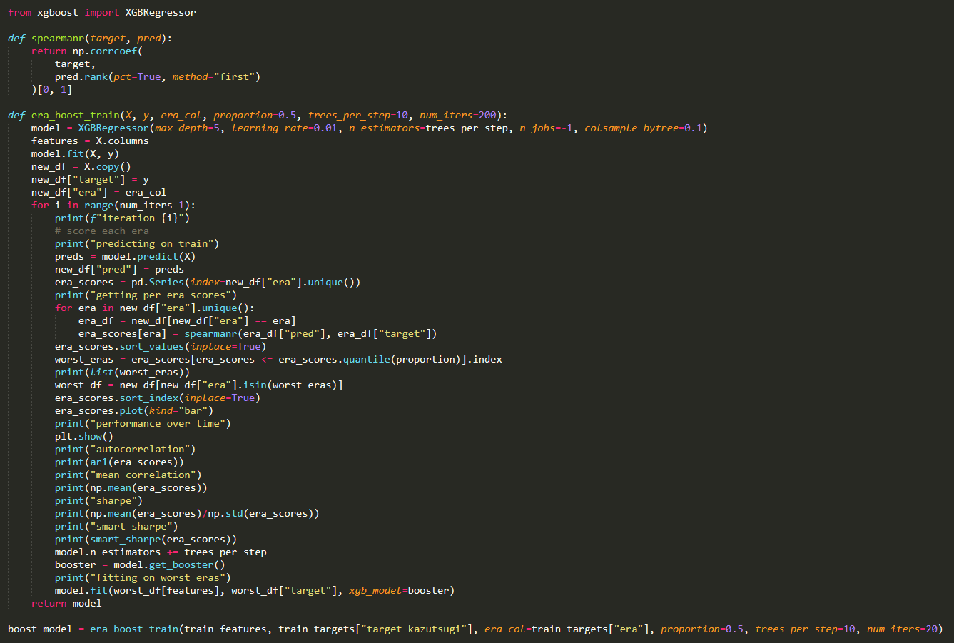 Michael Oliver: I mean yeah, you can play with all of the parameters of XGBoost as well, too. You can change the column sampling, the proportions (as you said). You can add whatever metric you want. It’s just using a mean-squared era to fit the thing, and you’re choosing which eras based on whatever metric you want. You could potentially put an auto-correlation metric in there, too.