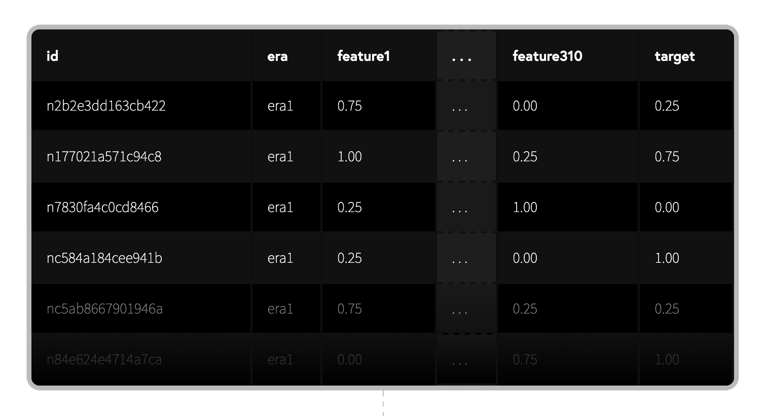 At a high level, each row represents a stock at a specific point in time, where id is the stock id and the era is the date. The features describe the attributes of the stock known on that date. The target is a measure of future returns relative to the date.